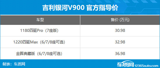 1月20日,吉利銀河V900正式上市,共推出3款車型,上市指導價30.98-36.98萬元,上市限時指導價26.98-32.98萬元。此外,現(xiàn)在下訂即享煥新禮、購置禮、紅包禮、金融禮、智行禮、質(zhì)保禮、交付禮、流量禮、躍階禮九重購車好禮。
