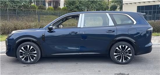 車側部分,該車采用傳統SUV造型設計,翼子板上設有攝像頭模組,門把手則為傳統樣式。尺寸部分,該車尺寸為5235mm*1999mm*1800mm,軸距3105mm,看齊理想L9、問界M9等大型SUV。